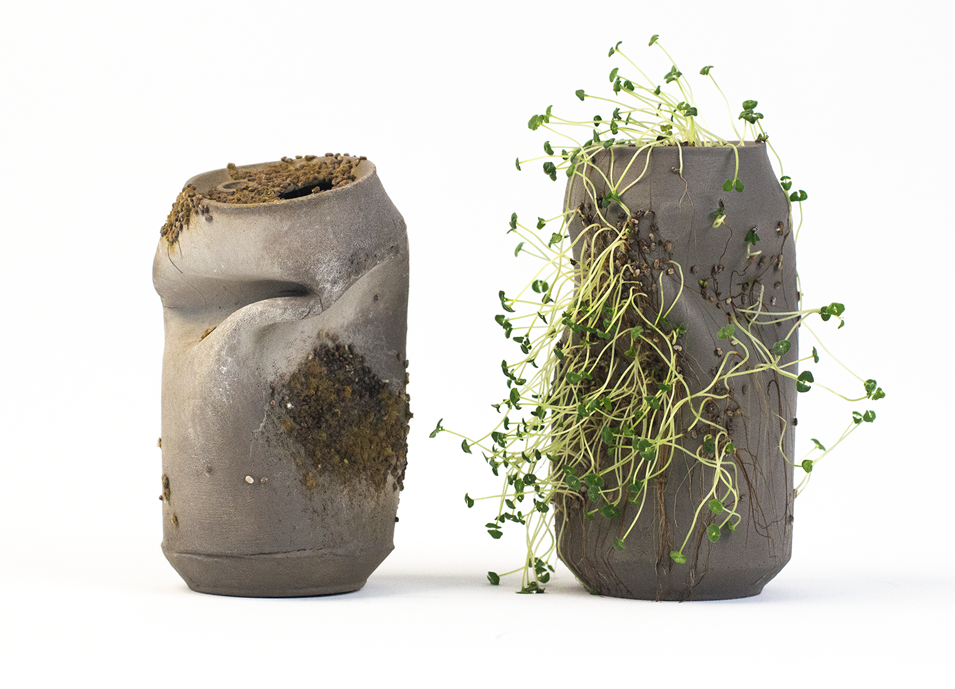 Clay cans, seeded with life. As roots break through, each object shifts — from symbol of waste to vessel of care.